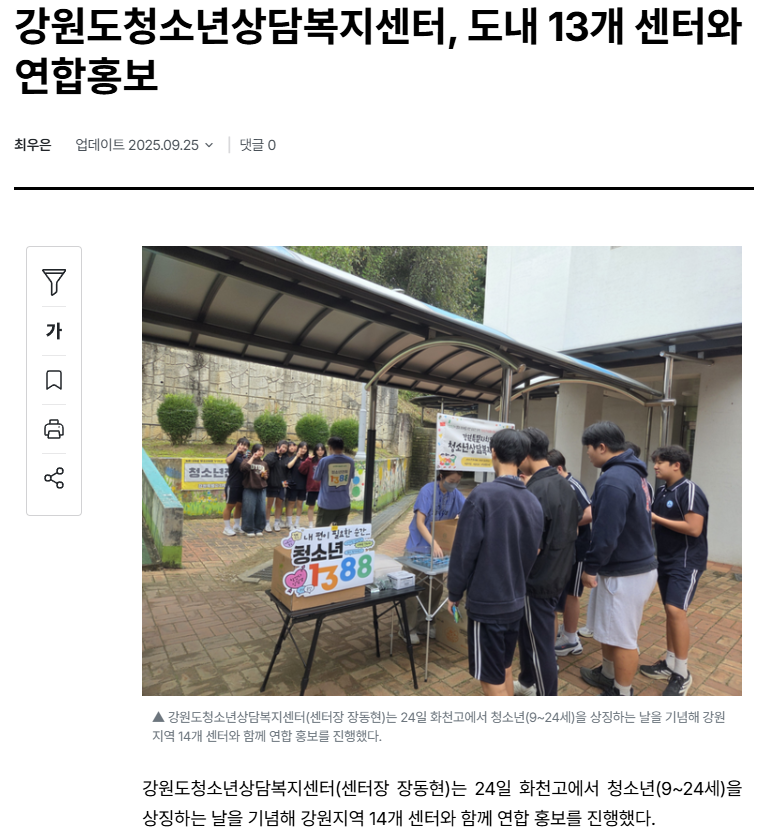 [강원도민일보] 강원도청소년상담복지센터, 도내 13개 센터와 연합홍보