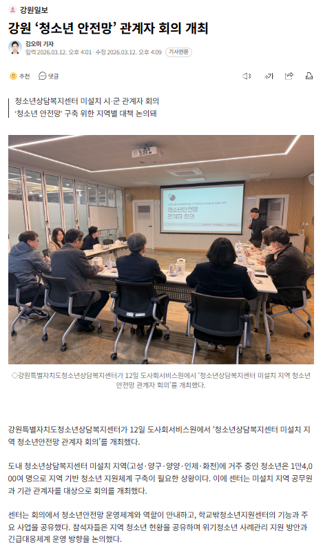 강원특별자치도청소년상담복지센터가 12일 도사회서비스원에서 ‘청소년상담복지센터 미설치 지역 청소년안전망 관계자 회의’를 개최했다.